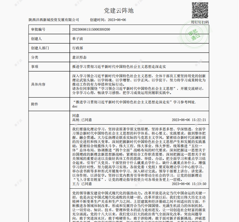 除線下面對面、點對點宣講外,灃西投資在釘釘黨建云平臺、微信群發起交流討論活動,不斷擴大宣講知識的覆蓋面和感染力,切實做到入腦入心。