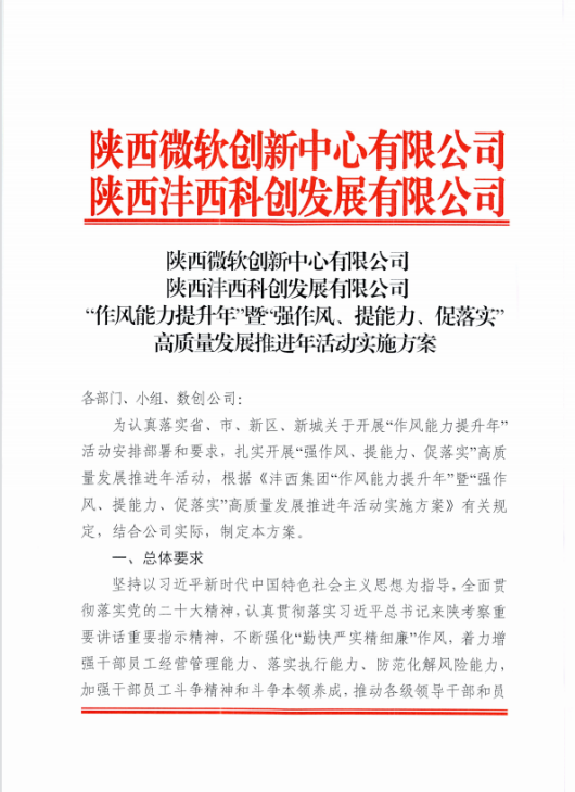根據集團部署安排,結合灃西科創&MIC公司實際,制定行之有效的“作風能力提升年”活動實施方案。召開全體干部員工大會,號召干部員工以時不我待的緊迫感“起而行之”,錨定目標,鉚足干勁,為全面完成公司2023年各項目標任務打下堅實基礎。
