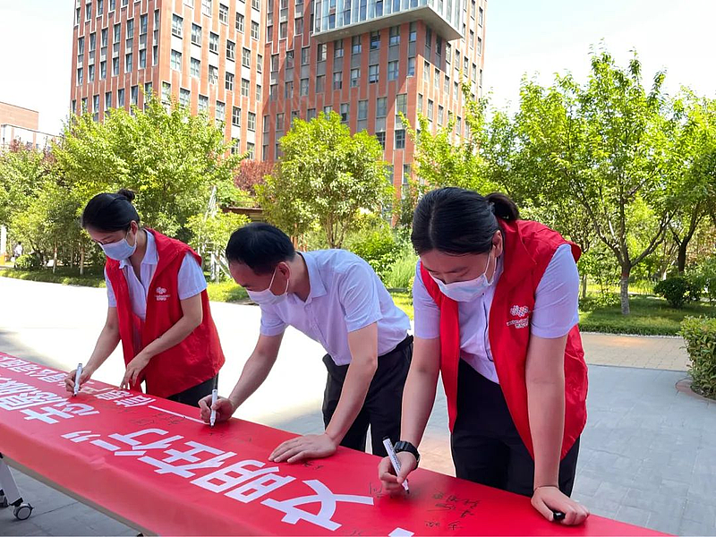 活動中,志愿者們還制做了“安全在心 文明在行”主題橫幅,到場志愿者和園區(qū)企業(yè)員工紛紛在主題橫幅上簽名,大家踴躍參與,現(xiàn)場氣氛熱烈。