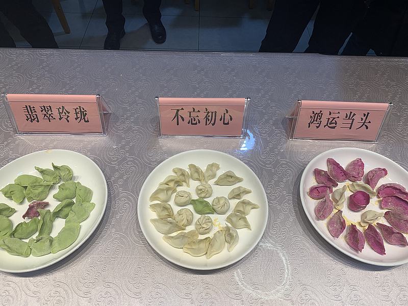 活動首先通過暖場小游戲將參與人員分為三組,根據菠菜、火龍果等不同顏色、不同口味的面團,設置“鴻運當頭”“不忘初心”“翡翠玲瓏”的組名,餐廳工作人員為大家演示包餃子的正確手法。