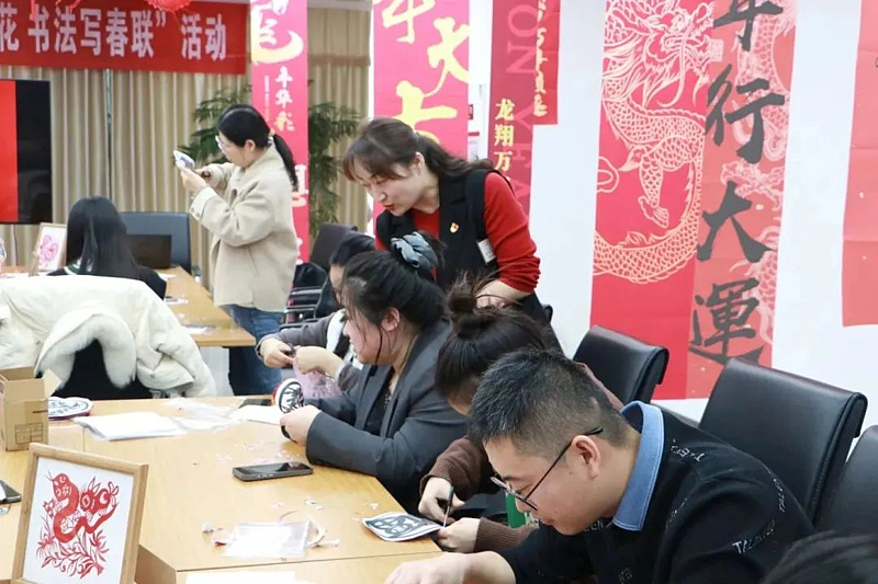活動現場,前來寫剪窗花、寫春聯的職工絡繹不絕。剪紙老師細致地為大家講解剪紙技巧,大家歡聚一堂,共同感受剪紙的樂趣,一剪一剪慢慢雕琢著“福”字和生肖“龍”,剪刀一起一落間紅色祝福灑落祥和。書法家鋪開紅卷,挽袖執筆,筆走龍蛇,潑墨揮毫?!叭覛g樂春來早,老少祥福慶壽高”“百花迎春福滿庭,萬事順意喜臨門”……一副副散發著清新墨香、飽含濃情與祝福的春聯躍然紙上,一字一墨賡續著傳統文化,紅紙黑字間映透著共同的祝福和心愿?;顒悠陂g,幾輪有關“龍”文化的有獎競猜活動引得現場員工陣陣歡呼,現場呈現一片歡樂、祥和、喜慶的氛圍。