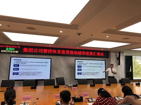 會上,易知行團隊匯報了灃西集團管控體系落地輔導工作的推進情況及下階段輔導計劃,重點就職能部門、子公司普遍關注的統一管理型集團管控模式,戰略管理、資金管控、招標采購管理等11項重點管控事項權限劃分以及集團管理類、業務類、輔助支撐類3大類14項管理制度的核心管控要點進行了深入解讀。隨后,易知行團隊對參會人員提出的問題和建議一一進行了解答。