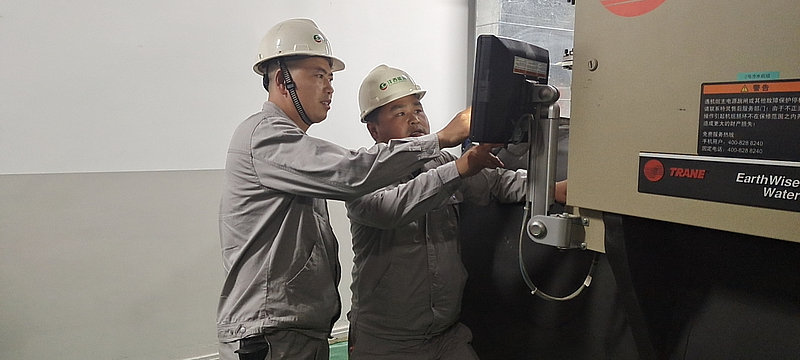 各項目負責人帶領值班人員對供冷系統全方位檢查,對冷機、循環水泵、冷卻塔、風機等設備進行巡查檢修,確保設備安全、穩定、高效運行。客服人員對所有用冷單位進行全面走訪。他們頂著炎炎烈日,冒著高溫酷暑,從總部經濟園到陜中二附院,從三一筑工到交大創新港,到處都能見到他們的身影。他們深入現場了解客戶的需求,在走訪過程中遇到戶內溫度不適、管道堵塞等問題,第一時間聯系維修人員上門處理,積極為客戶解決用冷的各種問題,讓客戶真切感受到貼心的服務,不斷踐行“我為群眾辦實事”的宗旨。