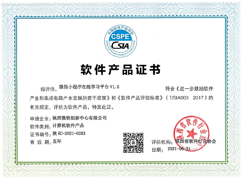 近日,經陜西省軟件行業協會評估審核,灃西集團陜西MIC成功獲批陜西省軟件行業協會第八批軟件企業,自主研發的“微信小程序在線學習平臺”獲得《軟件產品證書》,標志著陜西MIC軟件研發與服務能力又一次獲得權威認可。