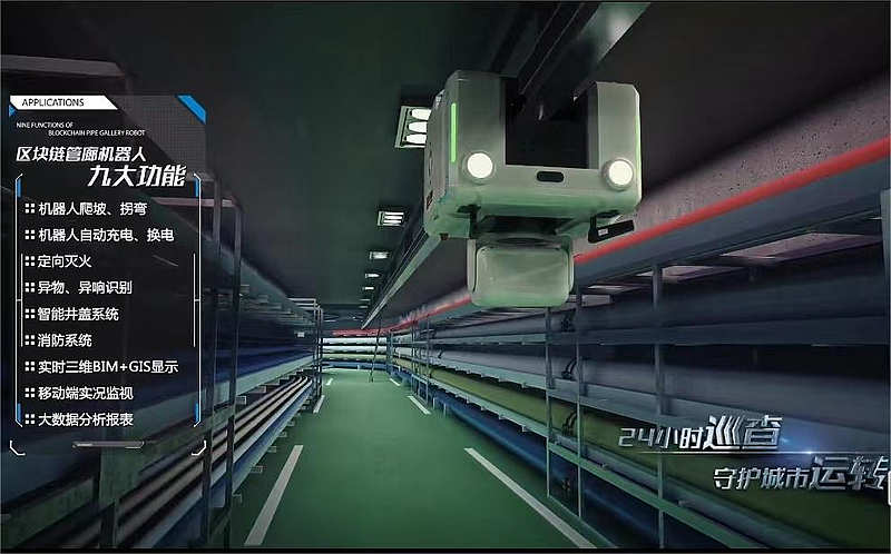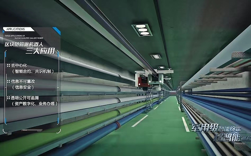 2020年8月,全球首個“區(qū)塊鏈+管廊機器人”智能巡檢監(jiān)測系統(tǒng)上線運行,標志著灃西新城綜合管廊開啟人工智能2.0時代。該系統(tǒng)利用區(qū)塊鏈技術去中心化、信息不可篡改、數(shù)據(jù)公開透明可追溯等天然優(yōu)勢,展現(xiàn)運維過程的三大應用場景。一是在中心服務器癱瘓情況下,巡檢機器人和滅火機器人觸發(fā)智能合約,在最短時間內(nèi)發(fā)現(xiàn)并有效消除火災;二是鏈上數(shù)據(jù)一旦生成,節(jié)點數(shù)據(jù)無法篡改,確保數(shù)據(jù)安全可靠;三是基于區(qū)塊鏈架構的“GIS+BIM”數(shù)據(jù)共享至相關單位組成的聯(lián)盟鏈上,管線入廊手續(xù)辦理時間從1個月縮短至5個工作日,大大節(jié)省各項成本。升級的管廊機器人還具備自動充電、自動換電、智能變軌、拐彎爬坡、移動端管理、大數(shù)據(jù)分析等九大人工智能功能。