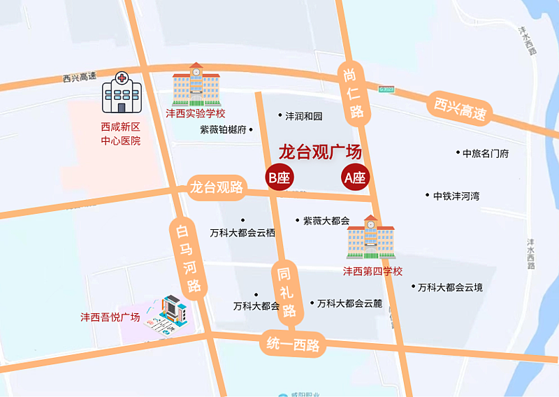 龍臺(tái)觀(guān)廣場(chǎng)商鋪位于灃西新城龍臺(tái)觀(guān)路與同禮路十字東北角、龍臺(tái)觀(guān)路與尚仁路十字西北角,為A、B兩座商業(yè)樓體,由地上五層和地下停車(chē)場(chǎng)組成,總建筑面積約32788m2,商鋪面積為107㎡--3115㎡不等,可根據(jù)商戶(hù)業(yè)態(tài)自由選擇。
