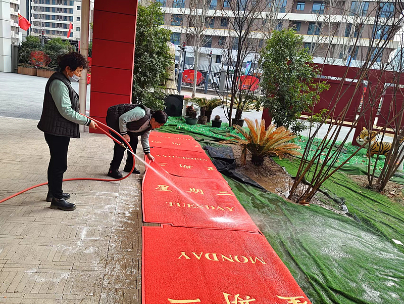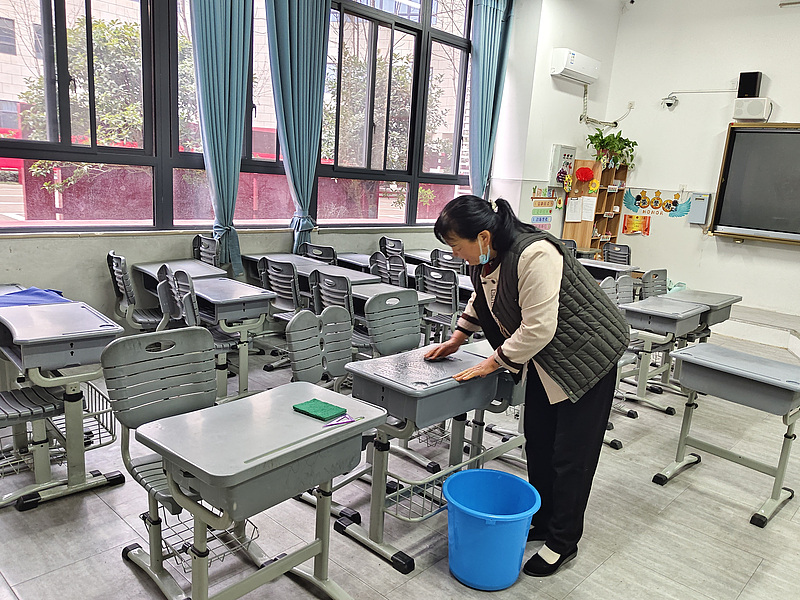 整潔的校園環境是提供優質物業服務的基礎職責,但要真正落實好,還要在細節上下足功夫。擦過的課桌纖塵不染,垃圾桶垃圾日產日清,夠得著的地方絕不留灰,夠不著的地方有雜物便想辦法用長柄掃把挑出,蹲著將地面殘留污漬一遍又一遍的擦洗......學校片區員工們“愛校如家”的精神,換來了學校日復一日的優美環境。