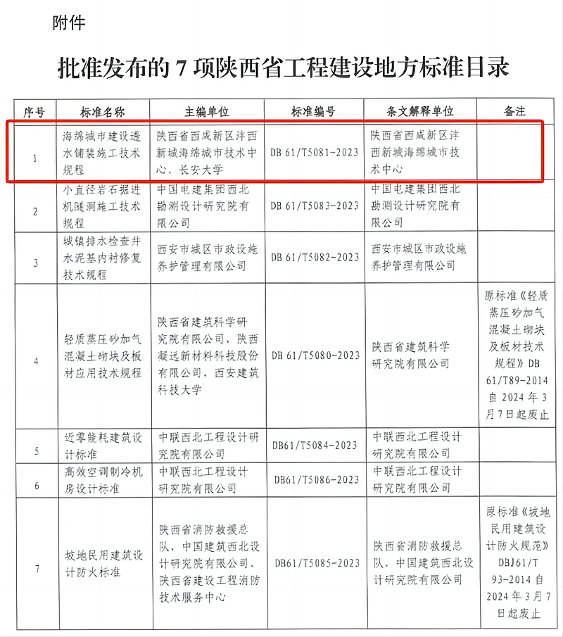 4月10日,由陜西省西咸新區灃西新城海綿城市技術中心(陜西西咸海綿城市工程技術有限公司)聯合長安大學主編的《海綿城市建設透水鋪裝施工技術規程》(DB61/T5081-2023)省級地方標準正式實施。