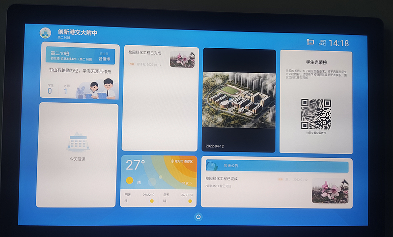 智慧教育應用方面,采用了云端與線下“雙模”的形式,將班級門前電子班牌與教室內電子白板有機互聯,具備“家校留言互動”“信息快速發布”“查詢課表”“學生考勤管理”“班風文化展示”等多種功能。