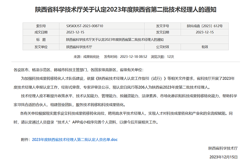 12月15日,陜西省科學(xué)技術(shù)廳發(fā)布了關(guān)于認(rèn)定2023年度陜西省第二批技術(shù)經(jīng)理人的通知,灃西科創(chuàng)&MIC7人通過認(rèn)定。