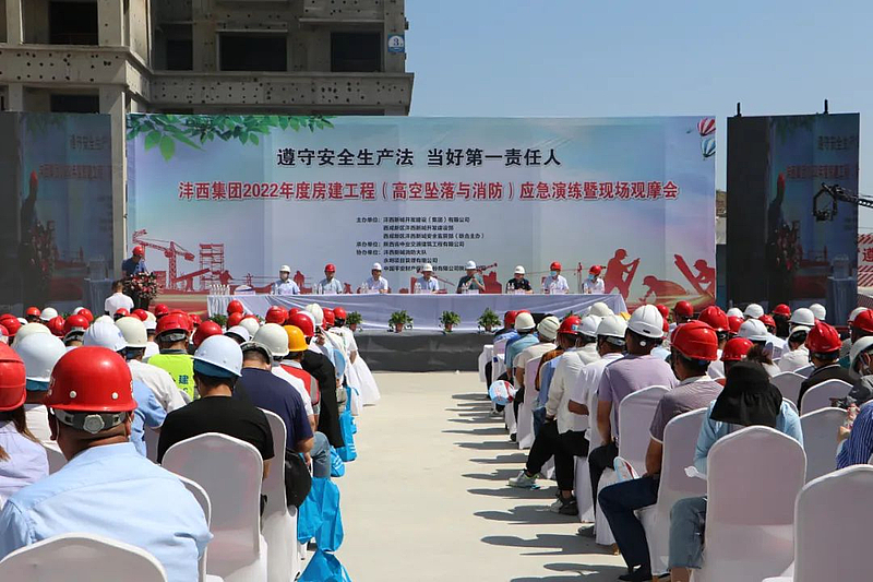 6月23日上午,灃西集團在王道新苑項目現場開展2022年度房建工程(高空墜落與消防)應急演練暨現場觀摩會,集團總經理郭廷喜致辭并宣布演練開始,副總經理張桂林參加。