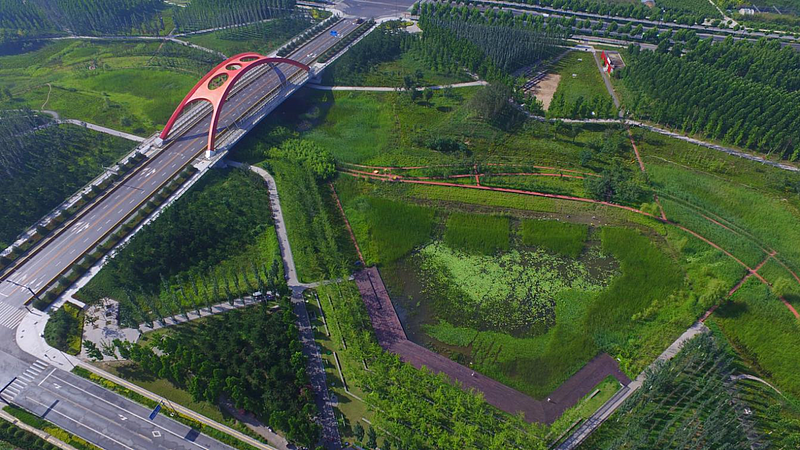 中心綠廊二期位于西咸新區灃西新城核心區,占地12.3公頃,北起開元路,南至天府路,西起灃渭大道,東至信息四路。綠廊用地類型為公園綠地,是灃西新城著力打造雨水系統的核心單元,既是生態廊道,又是城市通風帶,同時具有動物遷徙棲息、公共休閑、雨洪調蓄和景觀等多重功能。景觀實現了人工濕地、下滲濕地、景觀地形、景觀林帶等功能板塊,借助自然的力量收集、調蓄、凈化和滲透城市雨水,讓城市如同生態“海綿”般舒暢地呼吸吐納",恢復雨水的自然循環系統,同時,保障了城市的排水安全。