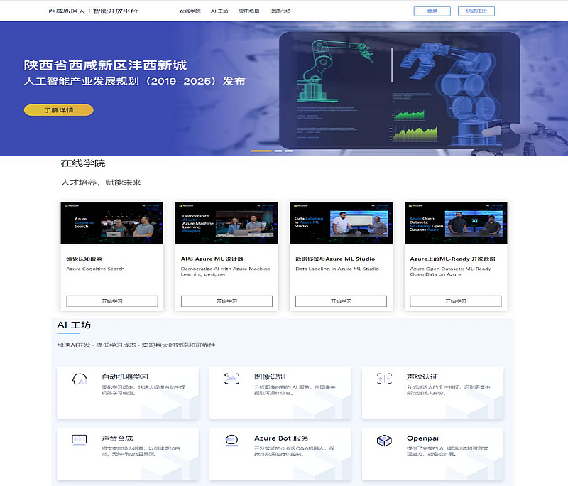 西咸新區(qū)人工智能開放平臺項目由集團公司二級子公司陜西微軟創(chuàng)新中心有限公司于2019年1月開始進行建設(shè),2020年9月完成上線。平臺服務(wù)于我省高校、科研機構(gòu)、開發(fā)型初創(chuàng)企業(yè)、政府、垂直領(lǐng)域各行業(yè),提供人工智能方向教學(xué)及認證考試、技術(shù)資源、訓(xùn)練平臺和數(shù)字化轉(zhuǎn)型解決方案的綜合性平臺。項目主要包含人工智能開放平臺、人工智能學(xué)院、人工智能加速器3大版塊,涵蓋線上與線下建設(shè)內(nèi)容。